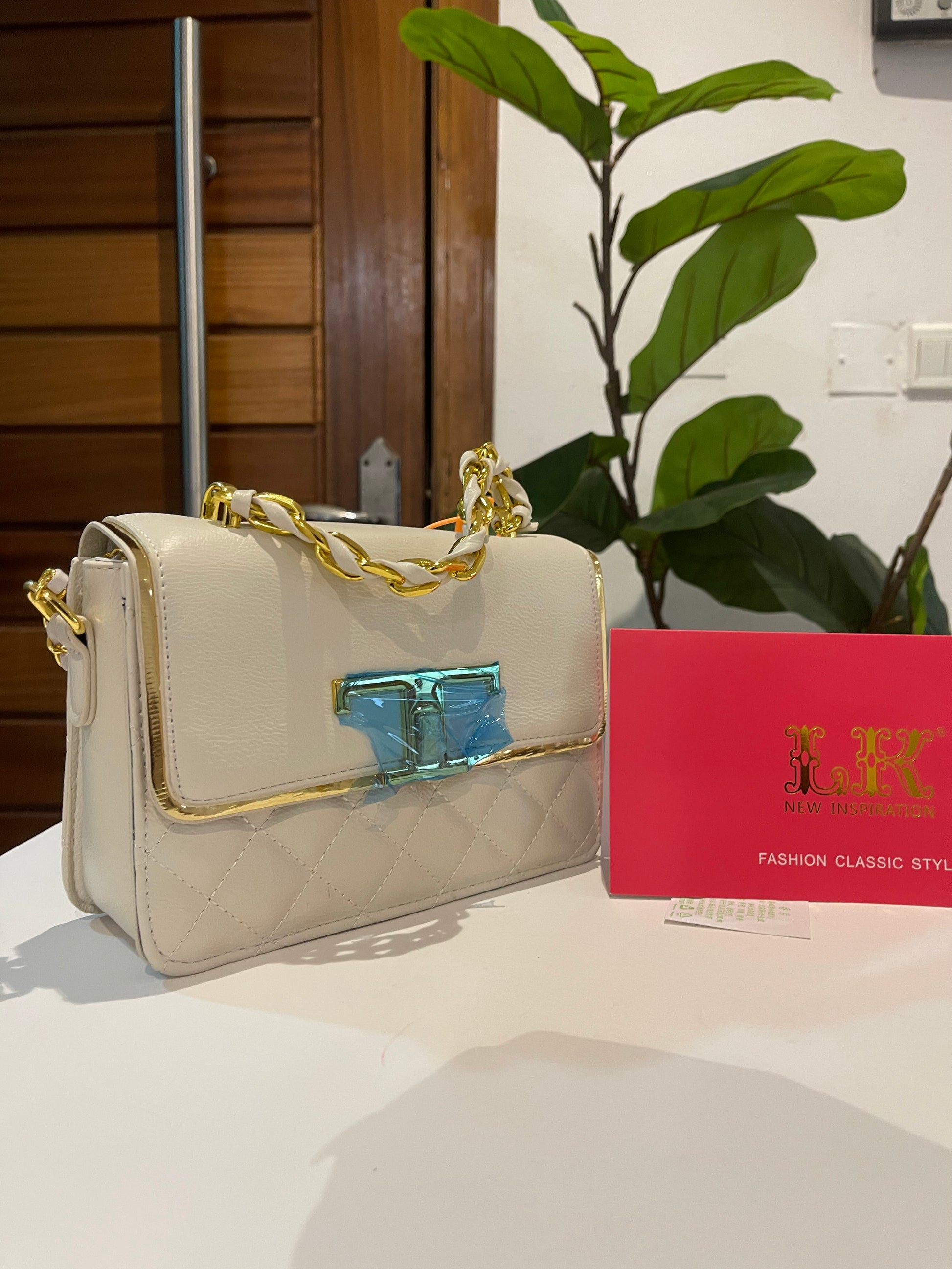Off white structured side bag with gift bag and gift card